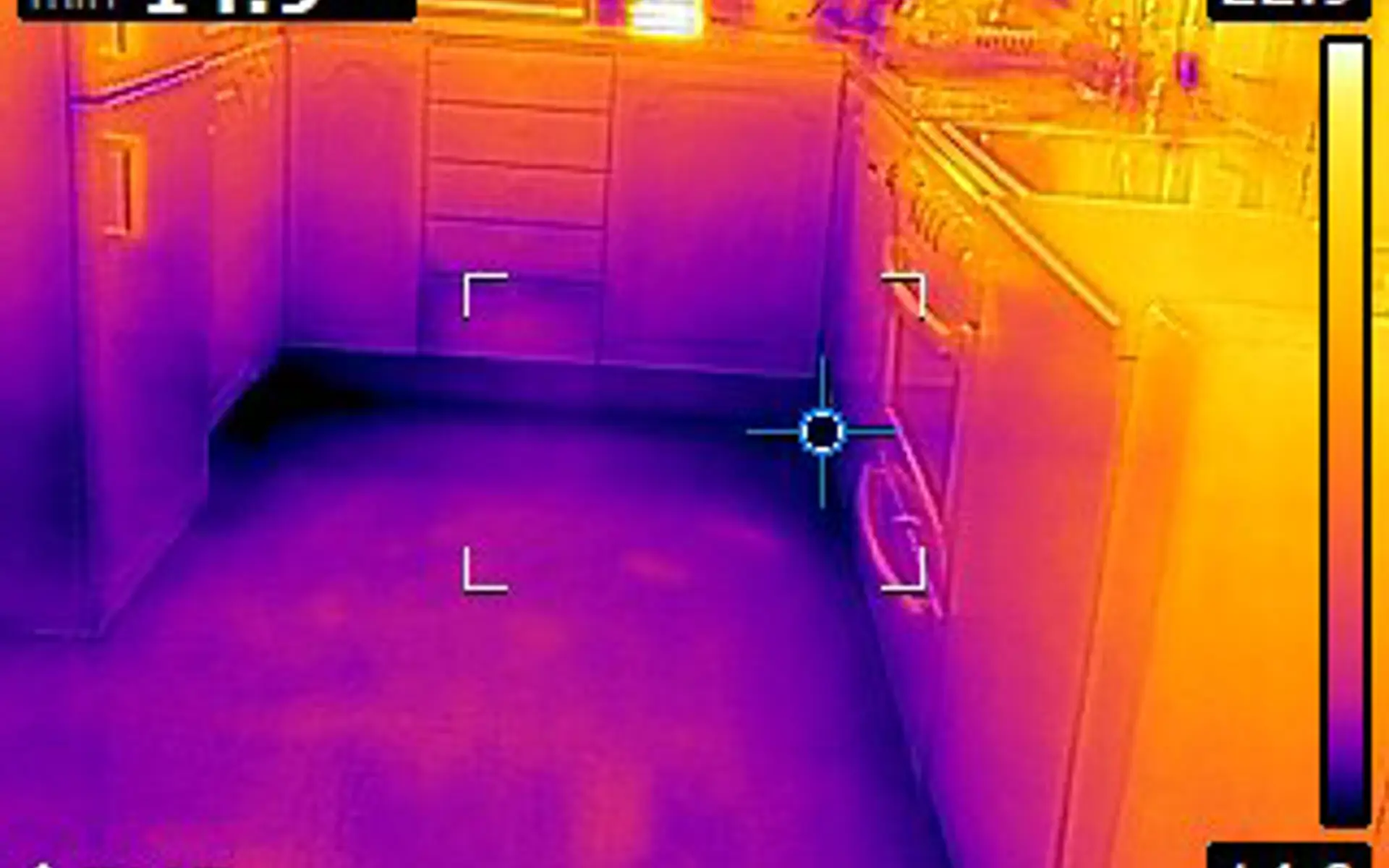 En digital värmekamera är enkel att använda, varma områden visas i ljusare toner(röd ton) och kalla områden (köldbryggor) i mörkare ton. Det gör det möjligt att identifiera bl.a. värmeförluster.