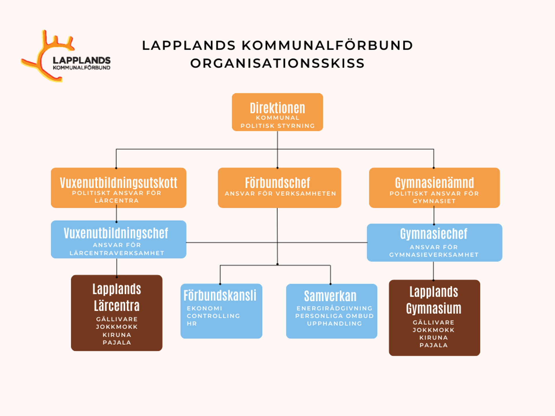 Organisationsskissen nedan visar hur dessa verksamheter är strukturerade och styrda inom Lapplands Kommunalförbund.